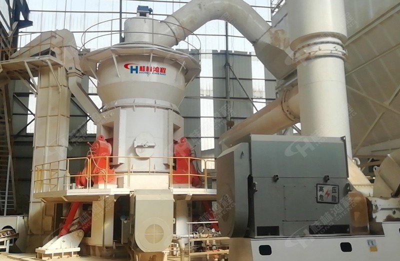 电动机驱动减速机带动磨盘转动,需粉磨的铝矾土由锁风喂料设备送入旋转的磨盘中心,在离心力作用下,铝矾土向磨盘周边移动,进入粉磨辊道。在磨辊压力的作用下,铝矾土受到挤压、研磨和剪切作用而被粉碎。同时,热风从围绕磨盘的风环高速均匀向上喷出,粉磨后的铝矾土被风环处的高速气流吹起,一方面把粒度较粗的铝矾土吹回磨盘重新粉磨,另一方面对悬浮铝矾土进行烘干,铝矾土细粉则由热风带入分级机器进行分级,合格的铝矾土细粉随同气流出磨,由收尘设备收集下来即为产品,不合格的铝矾土粗粉在分级机器叶片作用下重新落至磨盘,与新喂入的铝矾土物料一起重新粉磨,如此循环,完成铝矾土粉磨作业全过程。